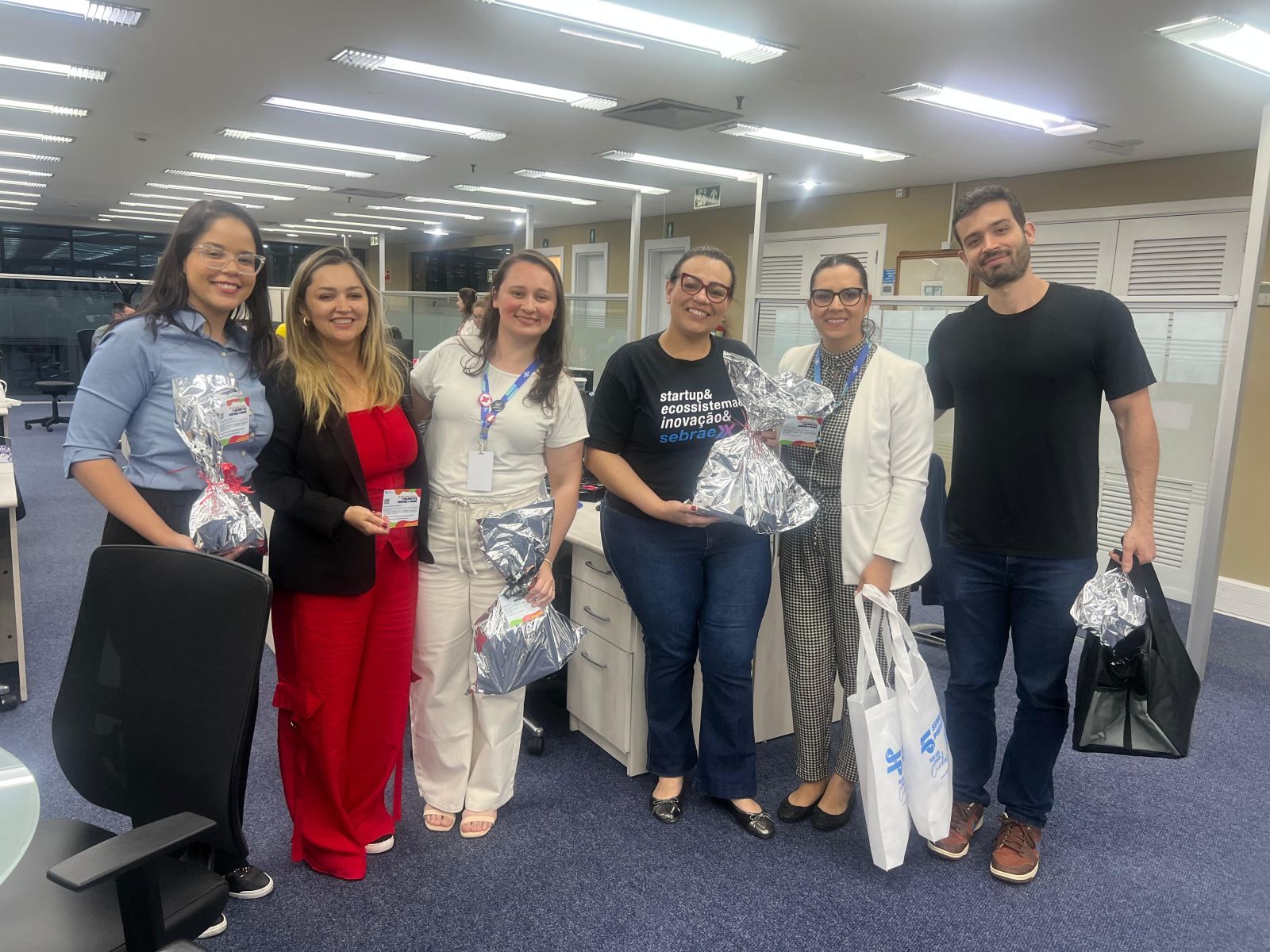 A equipe do Sebrae Previdência, formada por Dan Rodrigues, Luciana Cristina Braga e pela gerente de Seguridade, Luciana Ribeiro, foi recebida pela gerente da UGP, Analisa Benites, e pelos gestores do plano no Sebrae RS, Samanta Leal e Luiz Ávila, que acompanharam toda a agenda. Esse time foi responsável por entregar mais de 100 brindes (jogos, cofres e livros infantis) aos colaboradores com filhos de 0 a 6 anos de idade.