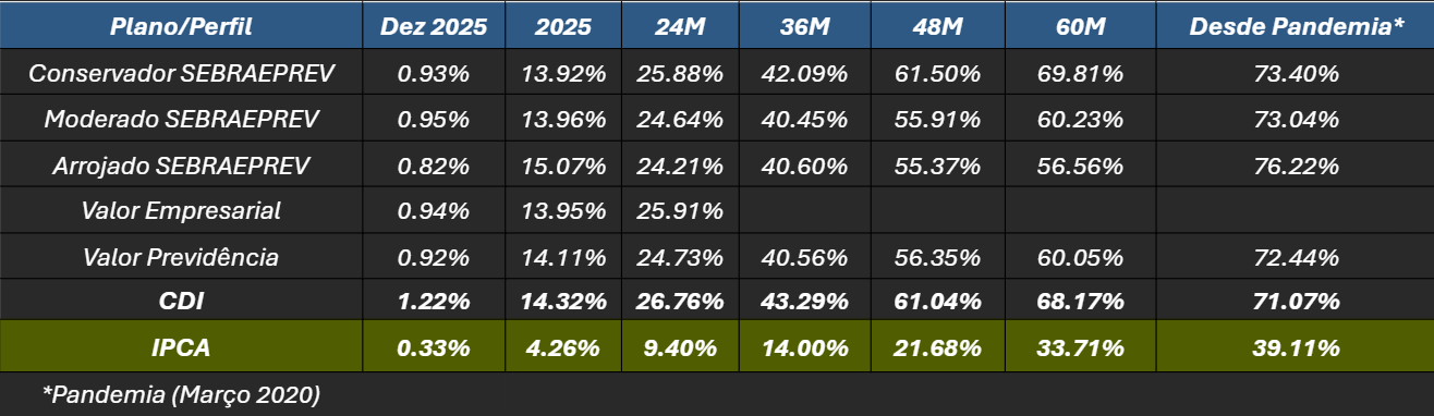 *Os resultados de 2025 reforçam uma mensagem clara: ganho real importa. Ao longo do tempo, ele é o principal determinante da qualidade de vida na aposentadoria. Com disciplina, gestão ativa e foco no longo prazo, o SEBRAE Previdência segue cumprindo o importante papel de proteger e expandir o patrimônio dos participantes, mesmo em cenários desafiadores.*